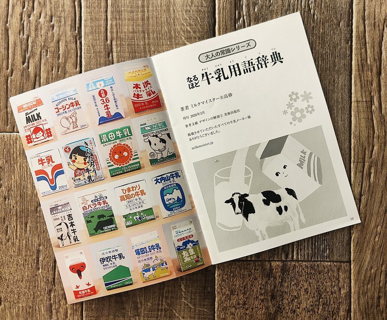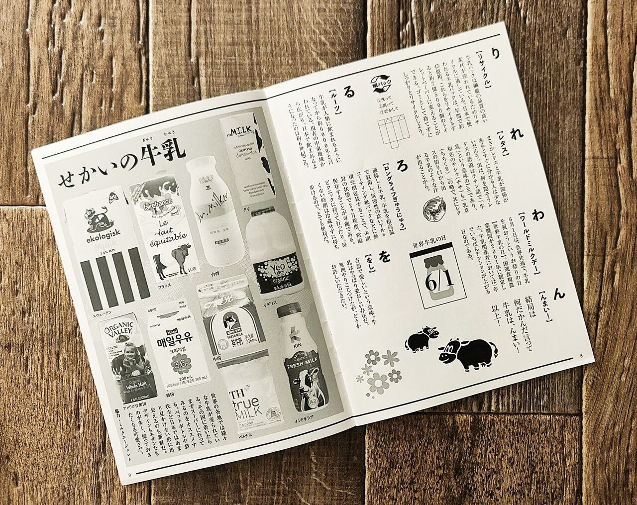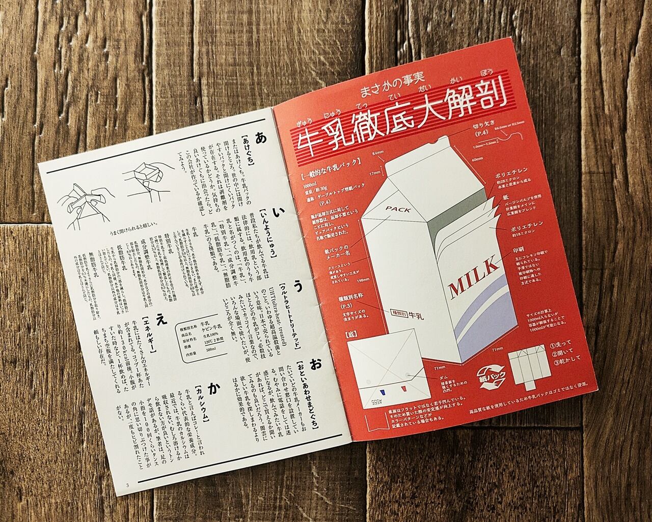 表紙をめくるといきなり目に飛び込んでくるのは「まさかの事実 牛乳徹底大解剖」。詳細なデータが添えられた、市販の一般的な牛乳パックの解剖図が描かれています。