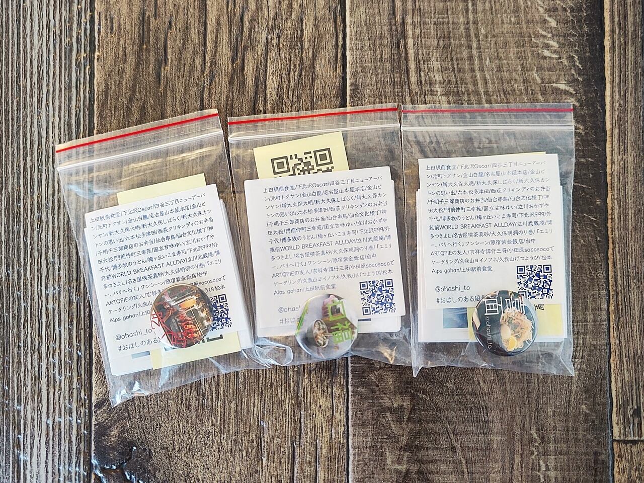 ちなみに缶バッチは3種類ありまして、香港のワンタンメンの〈口福〉、ロンドンのチャイナタウン〈吃了吗〉、日本のうどん屋さん〈喜面〉のなかからランダムに1つ当たります。ガチャ感あっていいでしょう?