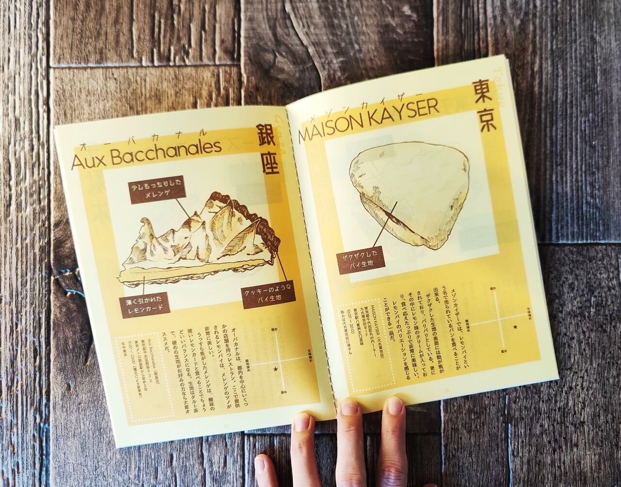 都内の洋菓子店などで食べられる19個のレモンパイを写実的なイラスト付きで紹介してくれます。パイ生地が網の目に乗っかったパイらしいタイプから、メレンゲの角が立ったケーキタイプまで。