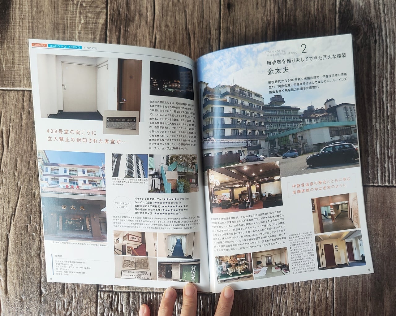 1号目の「群馬県伊香保温泉編」は、そんな伊東園ホテルの基本から、実際に宿泊した際の楽しみ方まで丁寧に説明してくれます。〈伊香保グランドホテル〉や〈金太夫〉など好景気な時代に増改築を繰り返して巨大化し、まるで迷路か要塞のようになった空間が身売りして第二の箱生(?)を送っている悲哀もそこはかとなく漂っており、令和時代にぴったりのチルスポット。