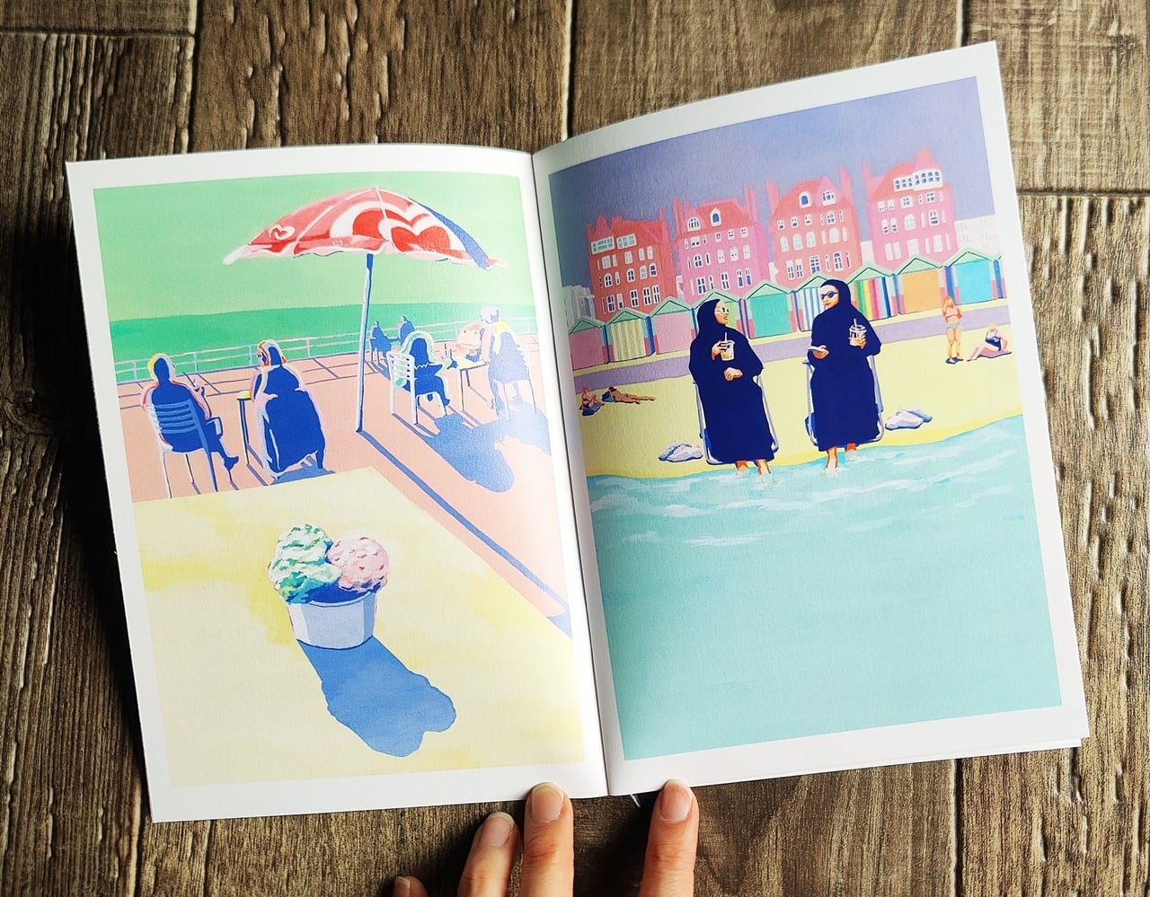 2023年から2024年にかけて1年間ブライトンで生活していた作者。目に映った色とりどりの街並みや、人種やジェンダーの多様性が当たり前という雰囲気で街に溶け込む人々の姿、眼光鋭くも人懐こく人間の隣で暮らすカモメ。帰国後にブライトンを思い出しながら、アクリルガッシュで描かれたイラストを見つめていると、この世のものとは思えない境界に佇んでいるような気持ちにさせてくれます。
