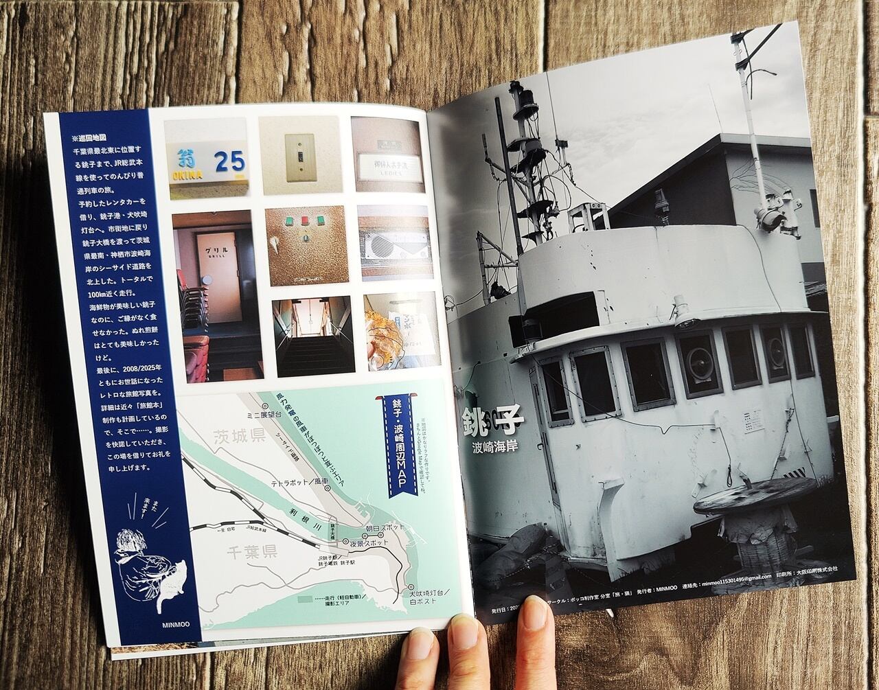 朝日や夕陽、そして晴天の青空も、自然と人工的なドボク建築が融合している景色って美しいですよねぇ。同志にぜひ届けたいフォトメインのZINEです!関東近郊にお住まいなら1泊2日ぐらいで朝と夜の光景を見に、銚子プチ旅なんていいですね。