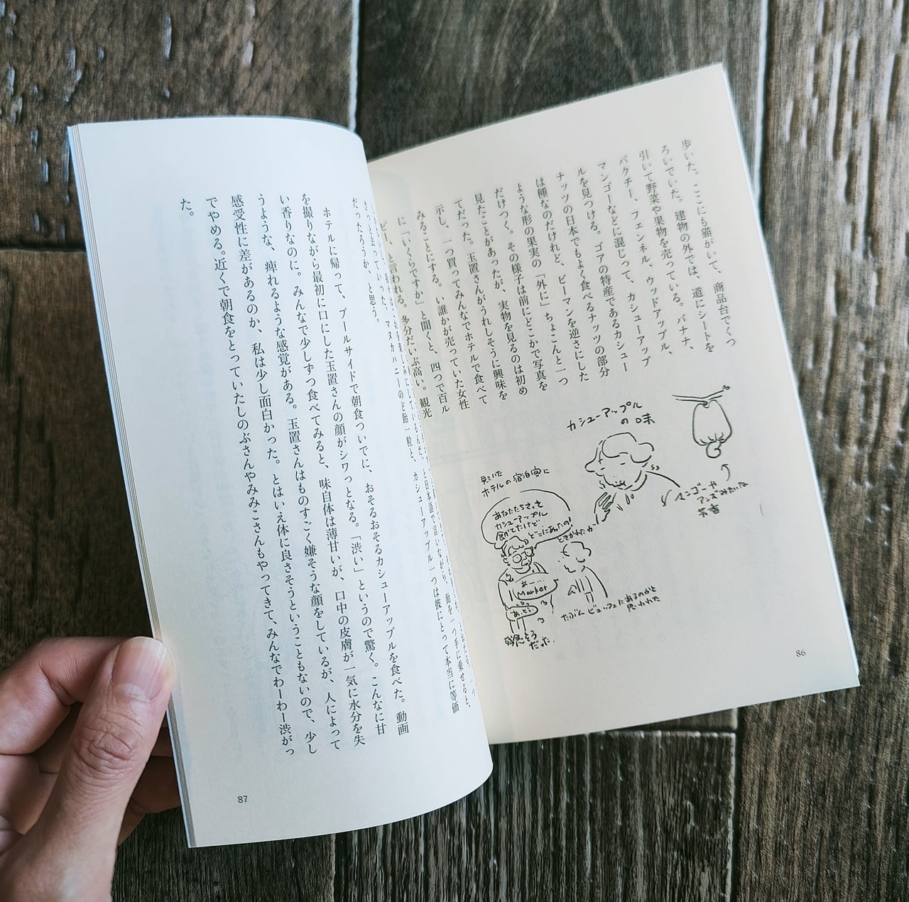 バンガロールに3泊、マドゥライに2泊、ゴアに2泊。約1週間のインド旅行。機内食やミールス、ファルーダなどの図解イラストを見ながら南インドを旅している気分で読み進めていると、カシューアップル(カシューナッツの実の部分。ナッツは種の部分)を渋い顔をして食べるという体験があって、テンションがあがってしまいました。